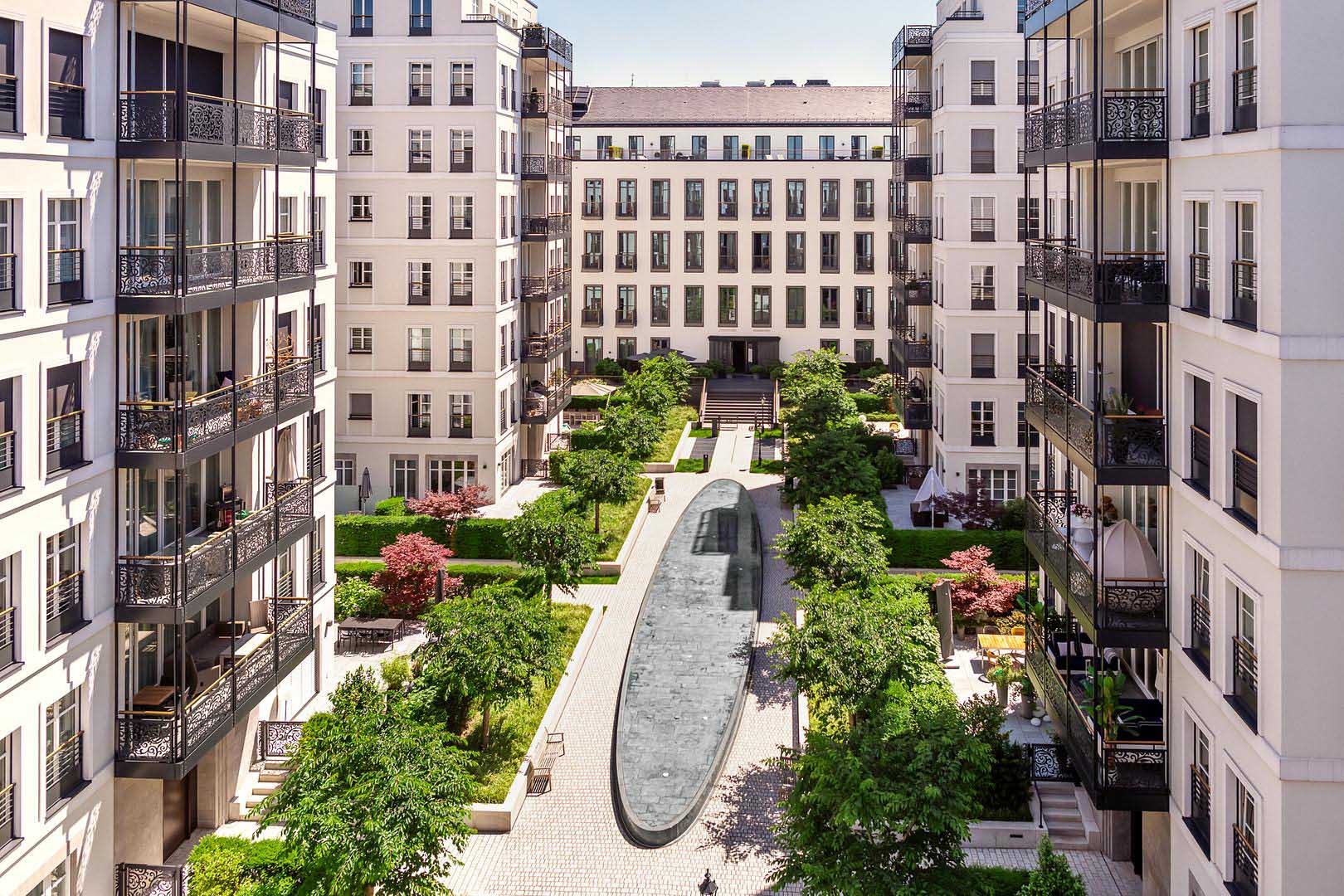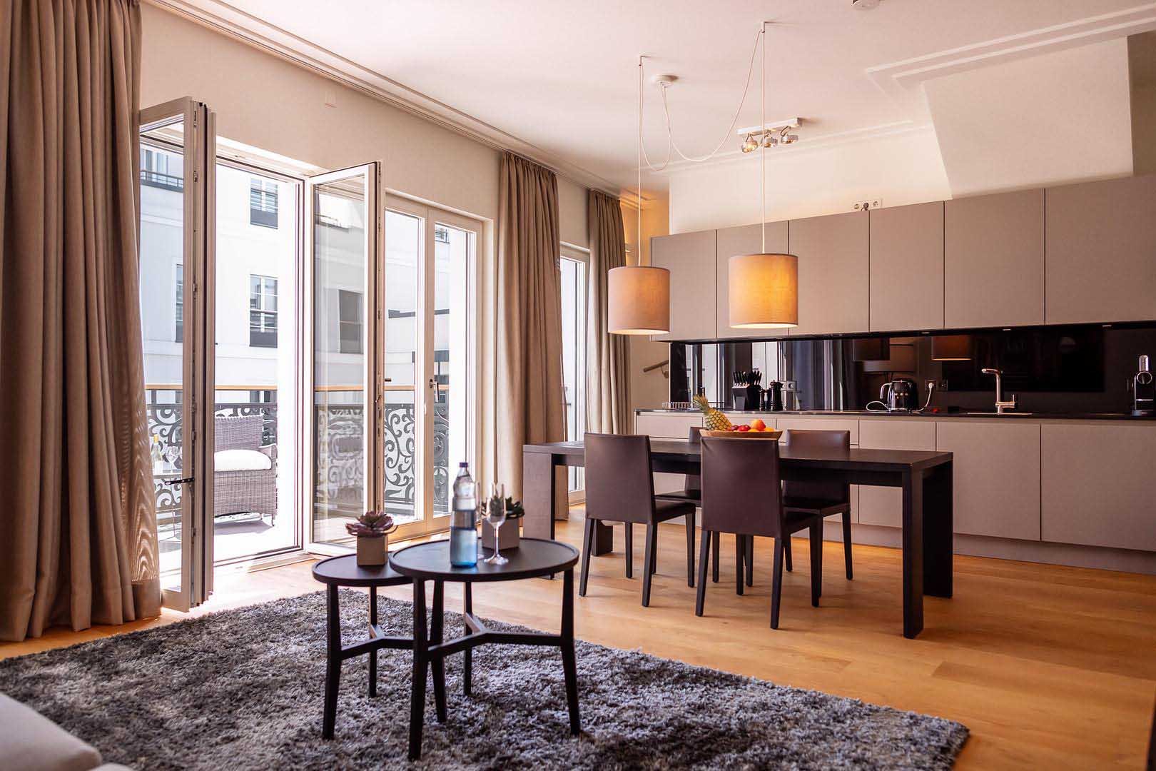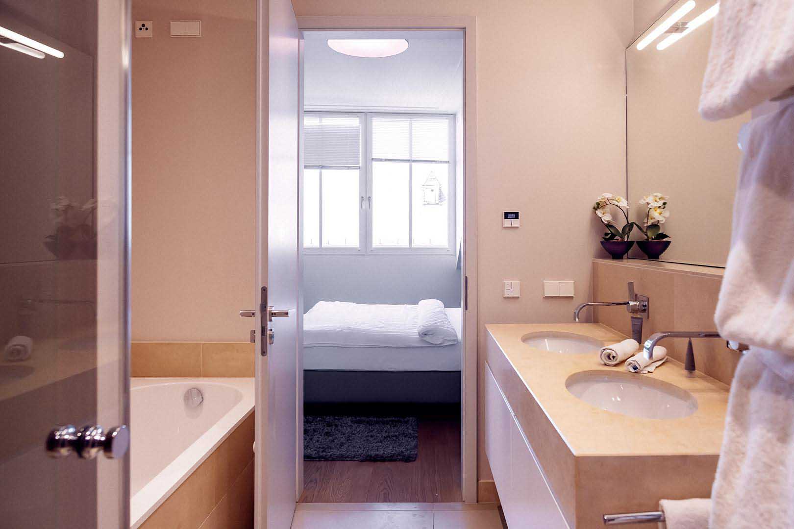 Die Penthouse Apartments erstrecken sich über zwei Etagen und beeindrucken vor allem durch ihre große und möblierte Terrasse. Von hier hat man einen beeindruckenden Ausblick auf Düsseldorf und in den Andreas Garten. Die Penthouses verfügen über zwei Badezimmer, ein Schlafzimmer mit Kingsize-Bett und einen großzügigen, repräsentativen Wohn-Essbereich mit voll ausgestatteter Küche.