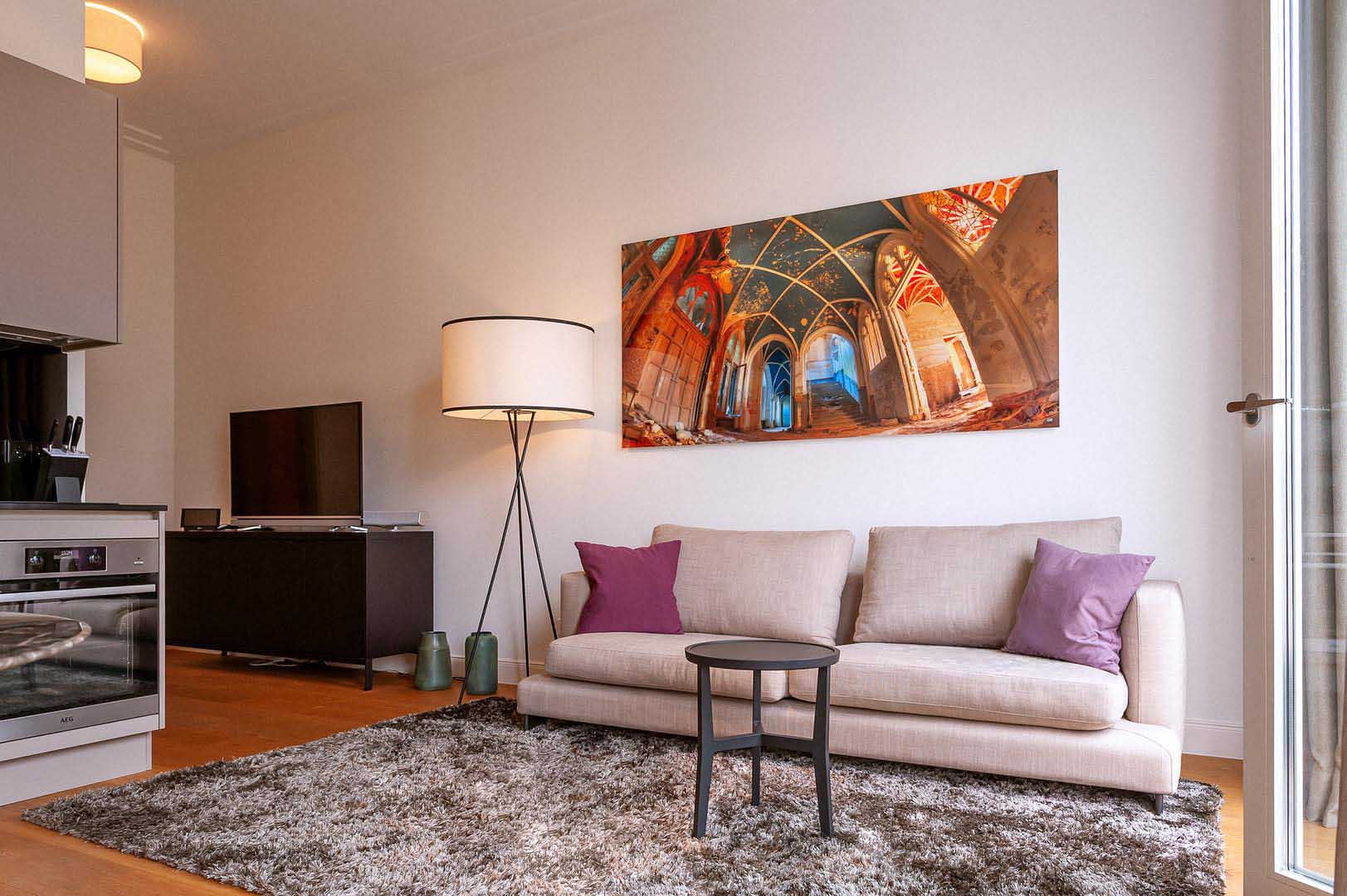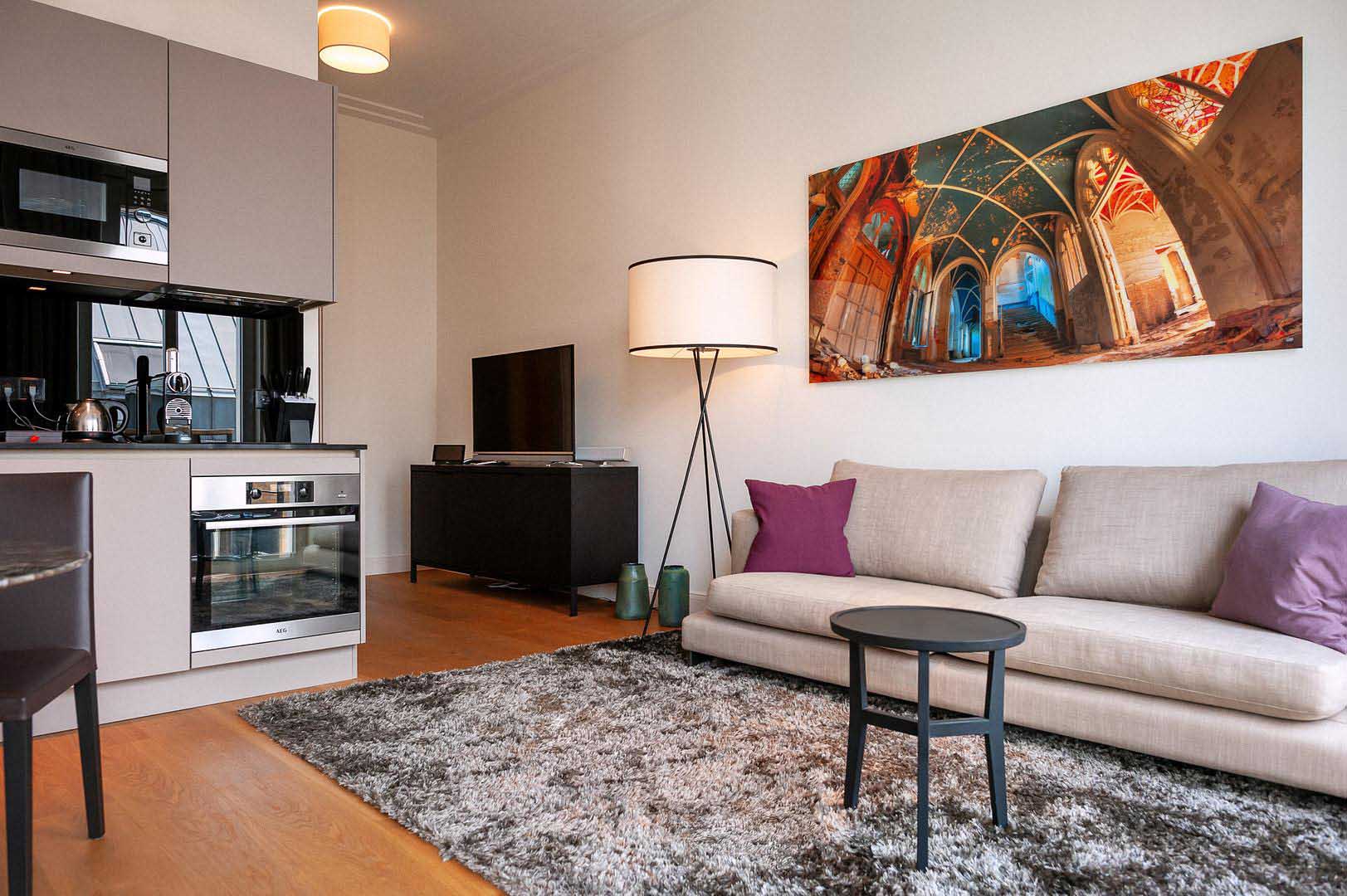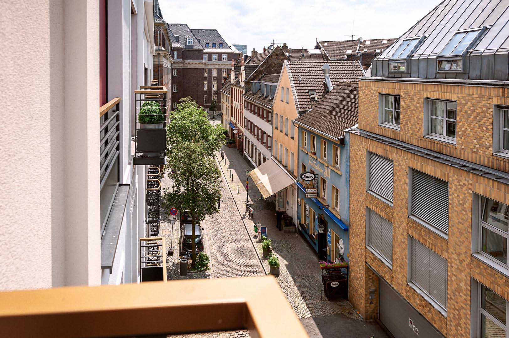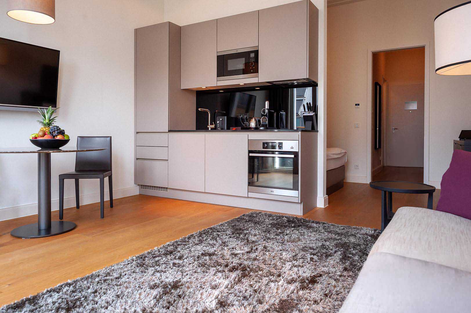 Smart, apart und elegant: Das Studio Apartment überzeugt trotz seiner kompakten Größe und bietet alles, was man zum Leben braucht. Zwei kleine Balkone mit Blick auf die historische Liefergasse runden das urbane Wohngefühl ab.